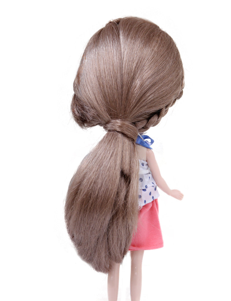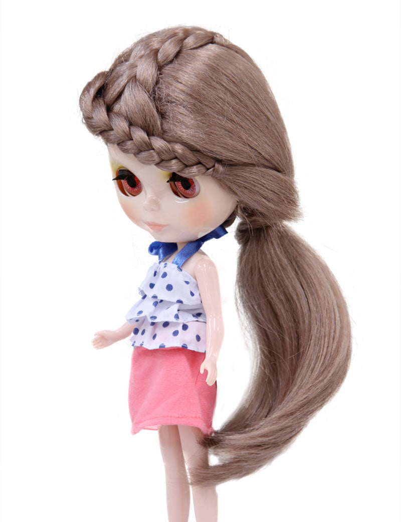 片側にさっと引かれた長い髪の編み込みの前髪のあるドールウィッグ B-144 もう1本の太い編み込みを引き戻す特徴があります