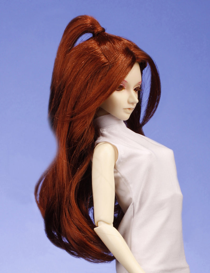 ロングウェービーハーフアップスタイルのカーリーダッチドールウィッグ W-636 ブリックレッドで 派手なシェイプ