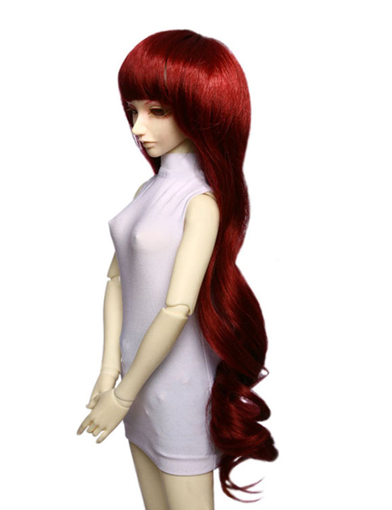 カジュアルなロングウェービースタイルの人形のウィッグ W-629 ミッドナイトレッドで 魅力的なロックを巻いています