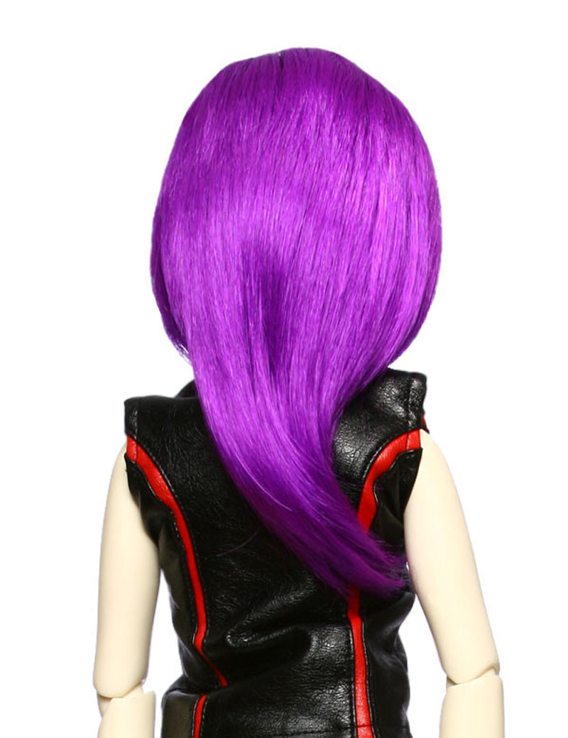クールなまっすぐな中くらいの髪型、太いフリンジの人形のウィッグ W-606、ネオンパープルで"V"のサインがしっかりとした印象を持っています。