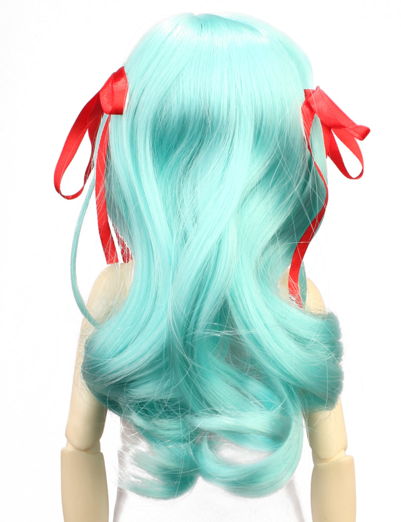 ビッグリボンと共に中程度の巻きカールのヘアスタイル魅力的なターコイズの人形のウィッグ W-673