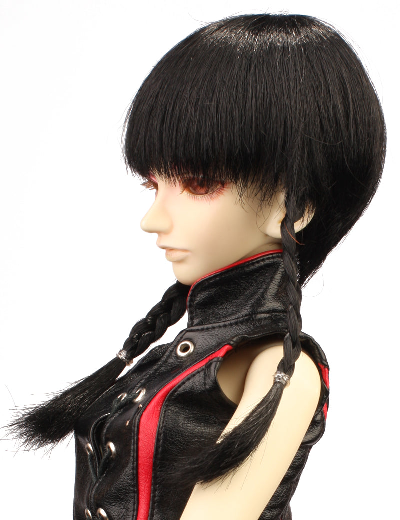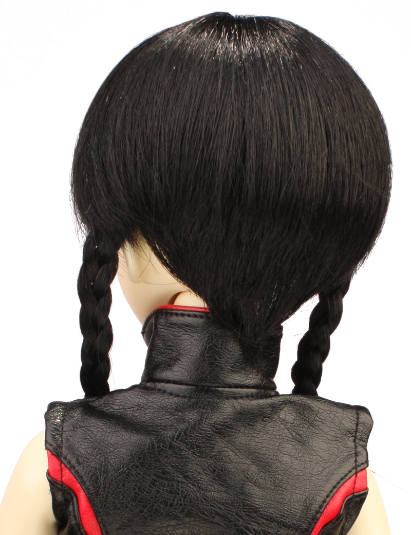 中程度の細いツインベイダヴィテールの人形のウィッグ W-696 ブラックの「V」の形